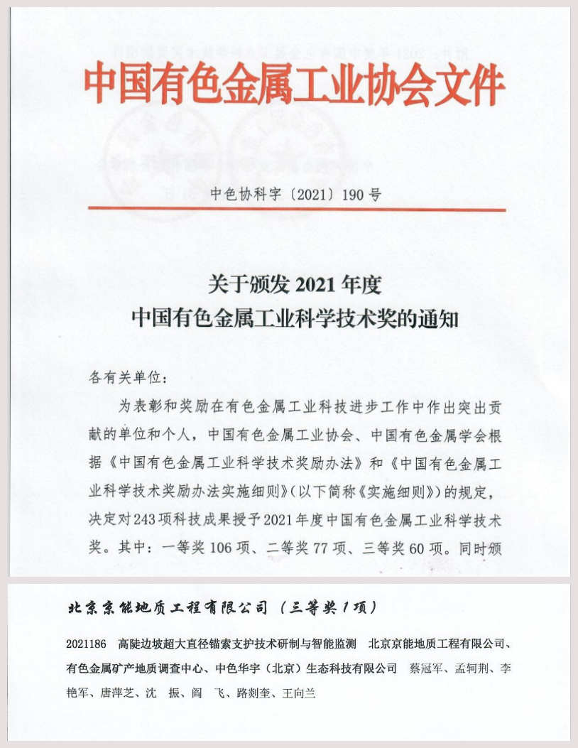 近日,中國(guó)有色金屬工業(yè)協(xié)會(huì)發(fā)布《關(guān)于頒發(fā)2021年度中國(guó)有色金屬工業(yè)科學(xué)技術(shù)獎(jiǎng)的通知》(中色協(xié)科字[2021]190號(hào))。北京京能地質(zhì)工程有限公司報(bào)送的《高陡邊坡超大直徑錨索支護(hù)技術(shù)研制與智能監(jiān)測(cè)》成果榮獲2021年度中國(guó)有色金屬工業(yè)科學(xué)技術(shù)獎(jiǎng)三等獎(jiǎng)。