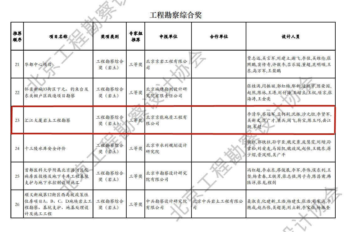 北京京能地質工程有限公司收到相關信息后,認真準備整理相關材料報送,北京市勘察設計協會經過層層篩選,嚴格評選,于2021年7月27日,官網發布了2021年“北京市優秀工程勘察設計獎”推薦獲獎項目清單,京能地質公司憑借《匯江大廈巖土工程勘察項目》獲得2021年“北京市優秀工程勘察設計獎”工程勘察綜合獎(巖土)三等獎。
