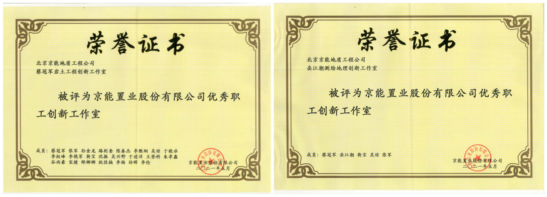 蔡冠軍巖土工程創新工作室和岳江潮測繪地理創新工作室同時獲得京能置業股份有限公司優秀職工創新工作室;《無人機航測傾斜攝影在工礦遺址上的應用》獲得京能置業股份有限公司2020年度科技創新獎勵二等獎;《利用 5G 技術和基坑自動化監測設備建立智能基坑監測系統》獲得京能置業股份有限公司2020年度科技創新獎勵三等獎;《錨桿隔斷式高壓注漿技術研究》獲得全員管理創新獎勵二等獎。