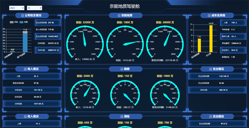 “京能地質(zhì)駕駛艙”模塊提供了公司整體的經(jīng)營指標展示。管理人員可以清晰地了解公司在全年的經(jīng)營狀況,有助于管理層對公司整體經(jīng)營情況有一個全面的把握,從而做出相應的決策。