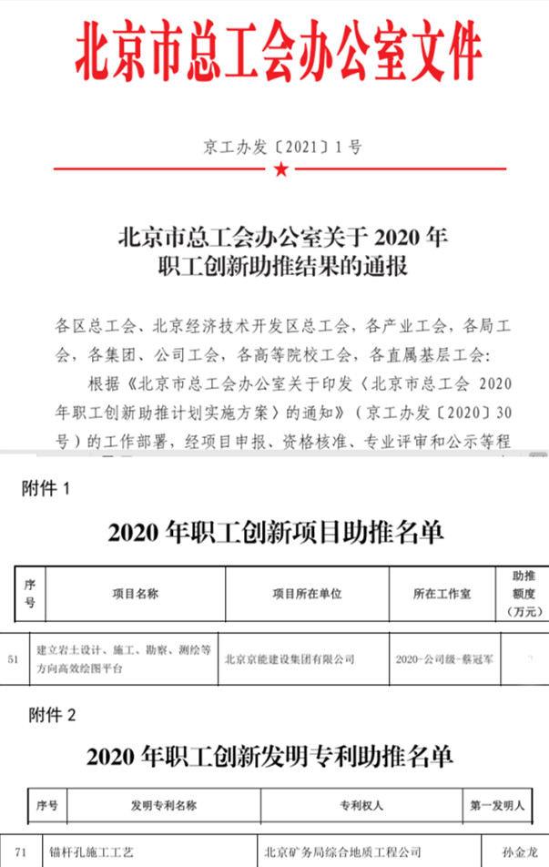 2020年9月30日,北京市總工會辦公室印發了《北京市總工會2020年職工創新助推計劃實施方案的通知》(京工辦發[2020]30號),鼓勵職工創新工作室圍繞企業生產一線的技術難題開展技術革新、技術攻關、技術交流等多種形式技術創新活動,對市級職工創新工作室和區、局、集團(公司)及職工創新工作室的創新項目進行資金助推。根據《助推計劃實施方案》,京能地質工會及時為蔡冠軍巖土創新工作室和孫金龍發明專利申報了助推資金計劃。經過市總工會資格核準、專業評審和公示等程序,蔡冠軍創新工作室申報的“建立巖土設計、施工、勘察、測繪等方向高效繪圖平臺”項目成為2020年度市總工會助推資金的68項創新項目之一,孫金龍的《錨桿孔施工工藝》發明專利也入選288項發明專利助推名冊。